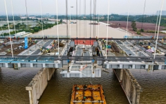 特大桥格子梁吊装是项目关键施工节点。格子梁吊装前进行预拼装,保证结构的整体尺寸符合设计要求,安装连接时严格按照工艺进行高强螺栓连接和焊接;钢格子梁节段采用外侧起吊,精准到达安装位置后,施工人员将吊...