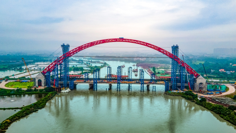 6月2日,经过16小时的奋战,世界最大整体提升跨径和吨位的钢管混凝土拱桥—平陆运河G75兰海高速钦江大桥右幅中拱段整体提升顺利完成。本次整体提升共20个拱肋节段,跨度232.2米,提升重量1900吨,提升高度49.1米,为集团内部首次将整体提升应用于大跨径钢管拱桥施工。