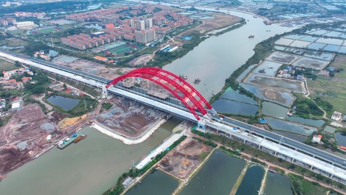 自今年项目开工以来,项目顺利攻克拱肋吊装、中拱段整体提升、管内混凝土灌注、格子梁合龙、桥面混凝土浇筑等多个关键节点,仅用10个月实现全桥主体结构贯通,以实际行动诠释“广西路桥速度”。