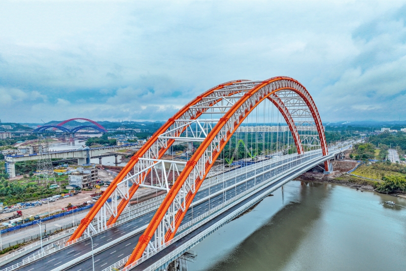 建设中,多项自主创新技术成为工程顺利推进的“硬支撑”。旧桥拆除首次采用“绳锯切割+400吨浮吊吊装”综合工艺,安全高效完成大跨径连续梁桥拆除;拱座基础浇筑创新应用水热化温升抑制剂,有效控制大体积混凝土温度裂缝;拱肋吊装依托自主研发的第四代缆索吊装系统,结合“缆索吊装+斜拉扣挂法”与BIM动态模拟,实现372米主拱高精度合龙;管内混凝土灌注采用“分级连续+真空辅助”工艺及尾料回收系统,保障了C70高性能混凝土灌注质量与绿色施工;桥面格子梁通过“工厂预制+现场拼装”模块化施工与“无应力整体控制法”,实现快速、精准安装。