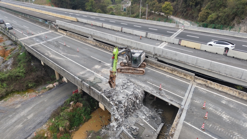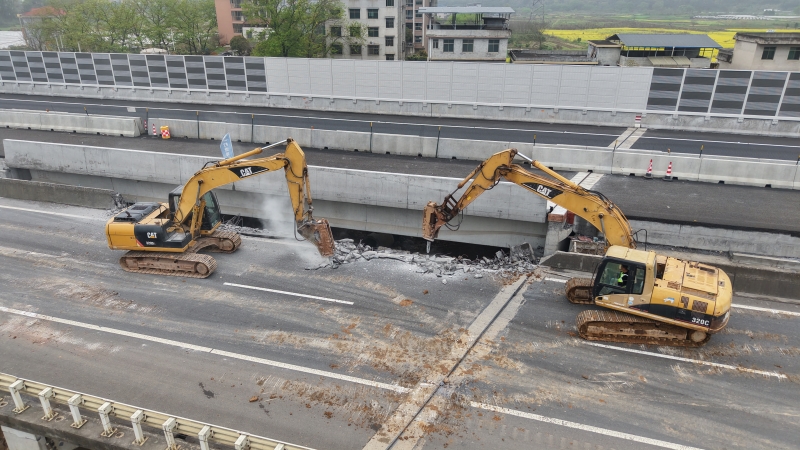 何家港中桥、水头村2号中桥均为项目主线关键节点工程,为多跨普通钢筋混凝土空心板桥,上跨村道。为保障拆除进度与作业安全“两不误”,项目部统筹调配6台炮机同步联合作业,精准控制拆除力度与施工节奏,最大限度减少对周边通行秩序的影响;现场严格落实安全防护措施,在桥洞口安排专人定岗值守、动态疏导交通,持续优化交通组织方案,实现道路通行安全与现场作业安全双向可控,保障拆除施工全程平稳有序、规范高效。