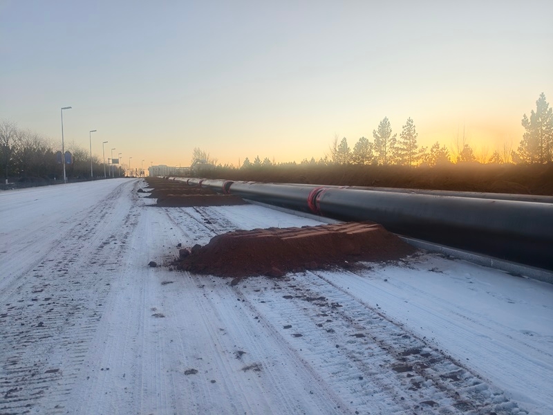 建设过程中,项目管线跨度大,长距离供热的温度保障更是核心难题,加之北方冬季严寒,冻土坚硬,给露天施工、管道铺设带来了极大挑战。项目团队精准施策,全面应用螺旋千斤顶对口安装、轻型井点降水、管节分段连接安装等精细化施工工艺,确保管网铺设的准确性、时效性和节能性,以及长距离供热高效稳定传输,进一步筑牢工程质量与安全生产的管控防线,助力区域 “双碳” 目标实现,让民生工程兼具生态效益。