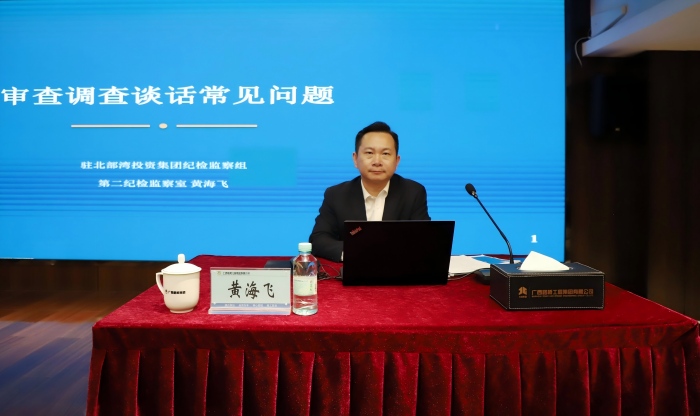 为进一步提升纪检监察干部审查调查专业能力,夯实监督执纪问责基本功,2026年3月17日上午,自治区纪委监委驻北投集团纪检监察组第二纪检监察室主任黄海飞一行来到广西路桥集团,开展案件审查调查谈话业务专题培训,全体纪检监察干部参与培训。